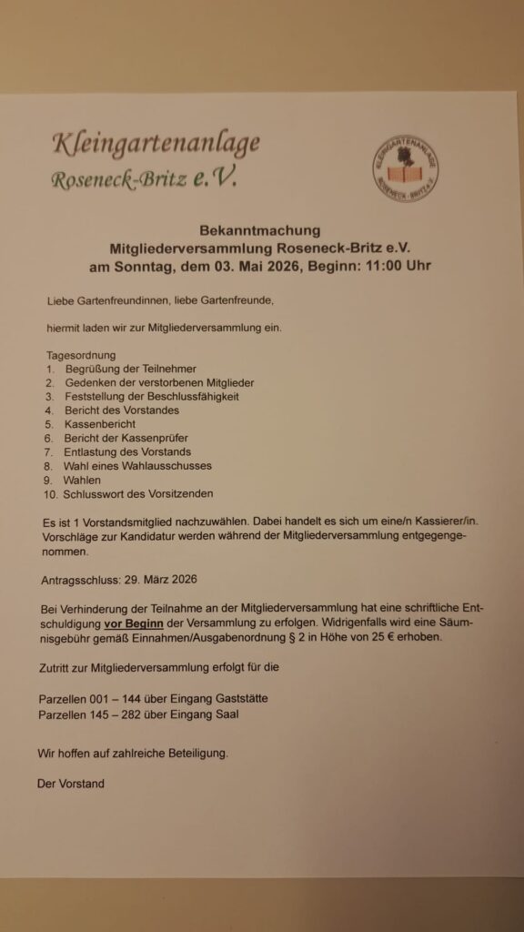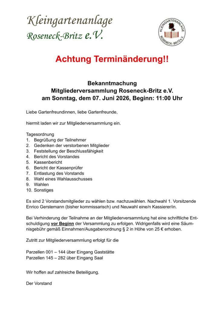 Die Mitgliederversammlung des KGA Roseneck-Britz e.V. wird aus rechtlichen Gründen verlegt.